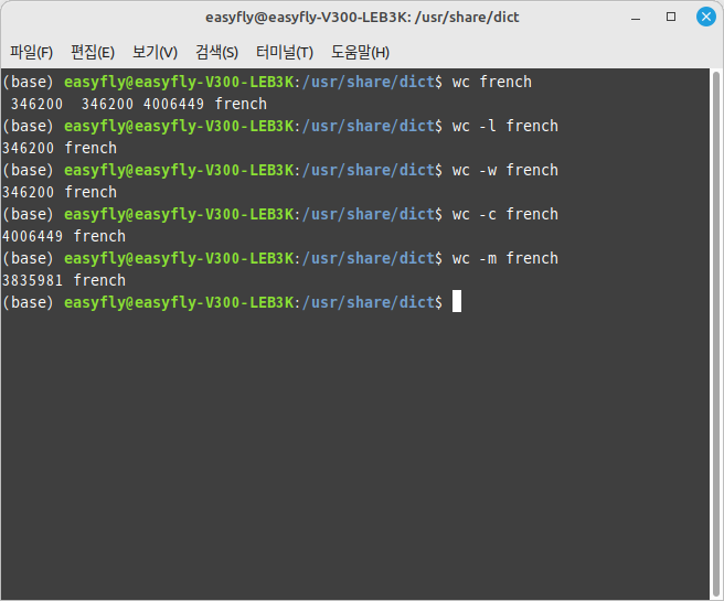 wc 명령어wc (word count) 명령어는 텍스트 파일의 줄 수, 단어 수, 그리고 바이트 수를 계산하는 데 사용됩니다. 이 도구는 스크립트에서 파일의 내용을 간단하게 분석할 때 매우 유용합니다.사용법wc [옵션] [파일명]옵션-l: 파일의 줄 수를 출력합니다.-w: 파일의 단어 수를 출력합니다.-c: 파일의 바이트 수를 출력합니다.-m: 파일의 문자 수를 출력합니다.예제파일의 줄, 단어, 바이트 수 출력하기wc filename.txt파일의 줄 수만 출력하기wc -l filename.txt여러 파일의 단어 수 계산하기wc -w file1.txt file2.txt정리wc 명령어는 파일의 기본 텍스트 통계를 제공하며, 스크립트나 명령줄 작업에서 파일의 내용을 빠르게 분석하는 데 도움을 줍니다. 간단한 ..