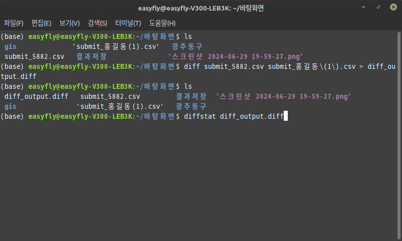 diff 명령어의 결과를 요약해서 보는 방법으로 diffstat와 같은 유틸리티를 사용할 수 있습니다. diffstat는 diff 결과를 요약해 주며, 변경된 파일 수와 각 파일의 변경된 줄 수를 그래프 형식으로 보여줍니다. 먼저 diffstat를 설치한 후 사용하는 방법을 설명드리겠습니다.diffstat 설치Ubuntu 기반 시스템에서는 다음 명령어로 설치할 수 있습니다:sudo apt-get install diffstatdiff 결과를 요약해서 보기diff 명령어를 사용하여 파일의 차이점을 파일로 저장합니다:diff -u submit_5882.csv submit_홍길동\(1\).csv > diff_output.diffdiffstat를 사용하여 diff 결과를 요약합니다:diffstat diff_out..