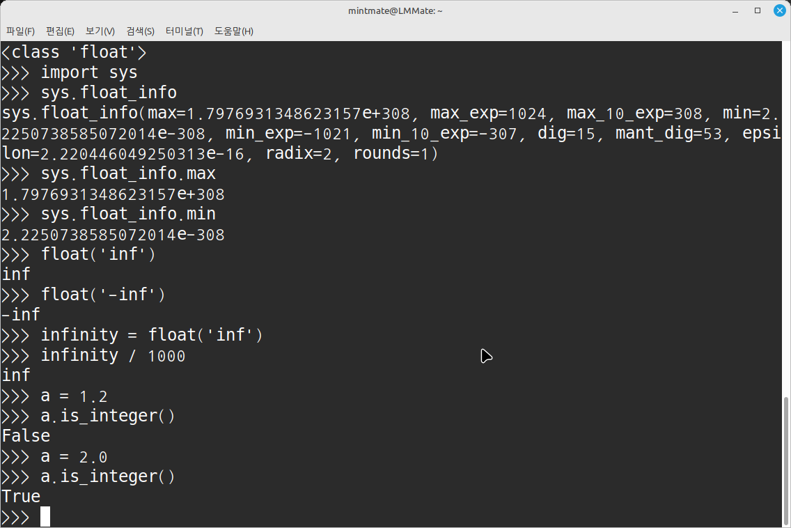 파이썬에서 실수형(float)의 세계: 무한대와 정수 판별까지파이썬을 배우다 보면 수치 데이터를 다루는 일이 많습니다. 특히 float, 즉 실수형 자료는 소수점이 포함된 숫자를 표현할 때 자주 사용됩니다. 이번 글에서는 파이썬에서 실수형 자료가 어떻게 정의되고 다루어지는지를 직접 실습한 결과를 토대로 소개하겠습니다. 특히 float의 최대/최솟값, 무한대 처리, 정수 여부 판별 등 실전에서 유용한 내용을 함께 다루겠습니다.1. 실수형(float)의 정의와 정보 확인파이썬에서 실수형은 float 클래스로 정의되어 있습니다. 먼저 이 타입의 정보부터 확인해보겠습니다.>>> import sys>>> sys.float_info이 코드를 실행하면 다음과 같은 결과가 나타납니다:sys.float_info(max=..