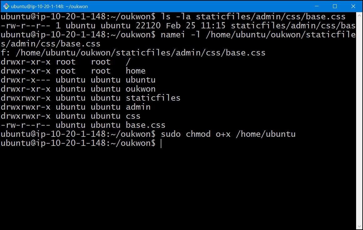 권한 문제를 한꺼번에 확인하는 namei✅ 1️⃣ namei란?namei는파일까지 가는 “경로 전체”의 권한을 한 단계씩 보여주는 명령어입니다.파일 권한만 보는 ls -l과 달리,상위 폴더들의 권한까지 모두 보여줍니다.✅ 2️⃣ 왜 403 문제에서 중요할까?Nginx는 파일을 읽기 전에 이렇게 이동합니다:/home ↓/home/ubuntu ↓/home/ubuntu/oukwon ↓/home/ubuntu/oukwon/staticfiles ↓admin/css/base.css이 중 하나라도 x(실행=통과) 권한이 없으면 → 403✅ 3️⃣ 사용 방법namei -l /home/ubuntu/oukwon/staticfiles/admin/css/base.css옵션 의미:-l → 권한까지 상세 출력✅ 4️..