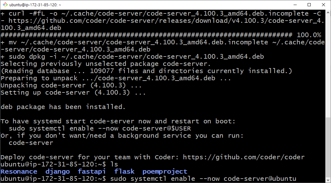 AWS VSCode Server 접속하기새로운 웹 브라우저 창을 열고 아이피와 포트번호로 연결하면 비밀번호를 물어옵니다. 환경 설정에서 입력했던 비밀번호를 입력하면 아래와 같이 VSCode가 열립니다. 물론 환경 설정에 따라 인터페이스 환경은 달리할 수 있습니다. 기본 환경은 Light모드입니다. 아래 환경 설정 버튼을 누르고 테마를 선택하여 변경합니다. 아래 터미널 창을 열고 웹서버 실행 등의 작업을 진행합니다. 이와 같이 VSCode는 한꺼번에 모든 작업을 할 수 있어 편리합니다.